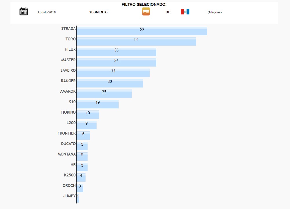 Entre os comerciais leves os dois modelos da Fiat lideraram com folga em Alagoas. A Strada ficou em 1º com 59 unidades e a Toro em 2º com 54 unidades. A Toyota Hilux terminou em 3º com 36 unidades emplacadas.