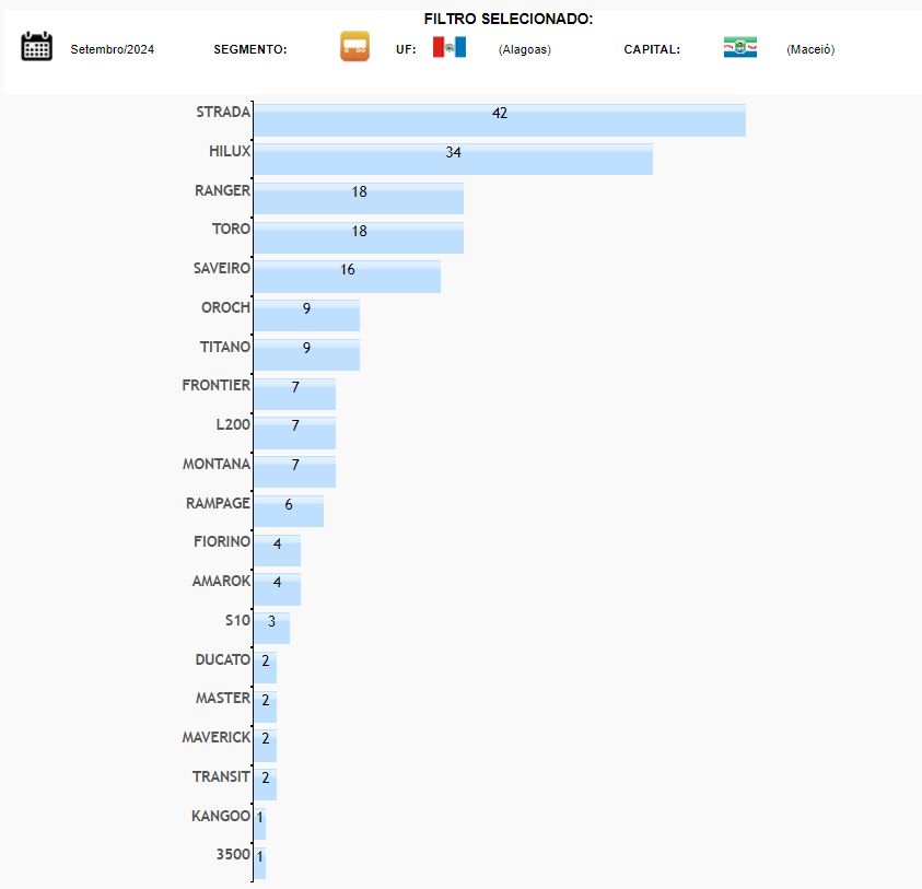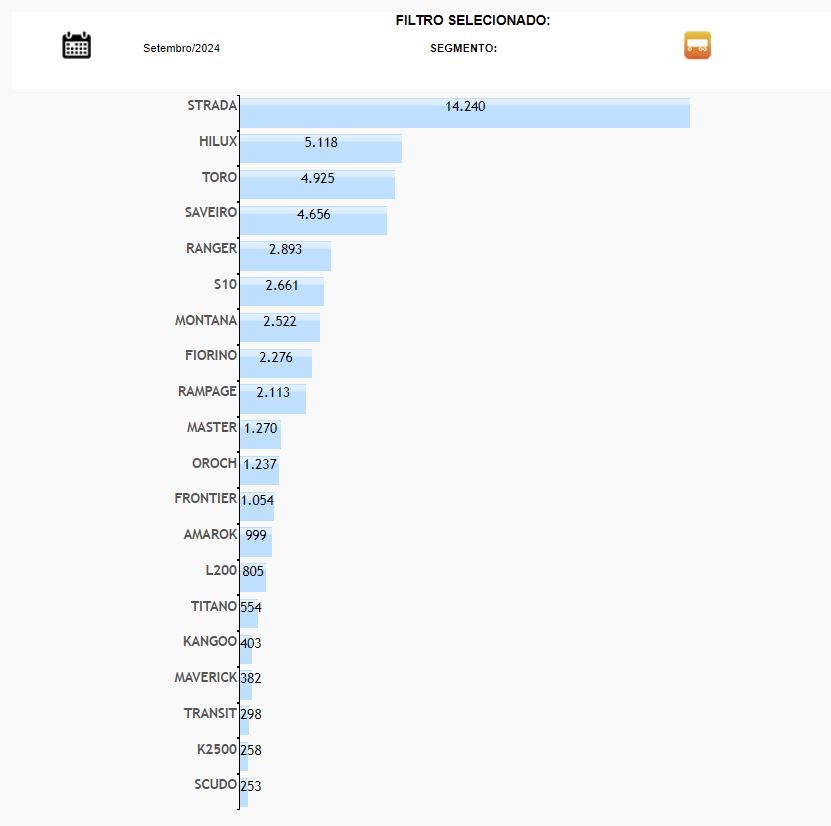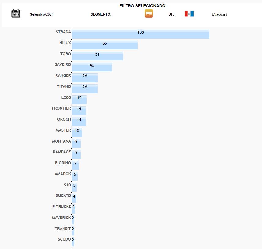 Considerando apenas o segmento de comerciais leves, os mais vendidos foram: Fiat Strada com 138 unidades, mais que o dobro de Toyota Hilux com 66 e Fiat Toro com 51 unidades.