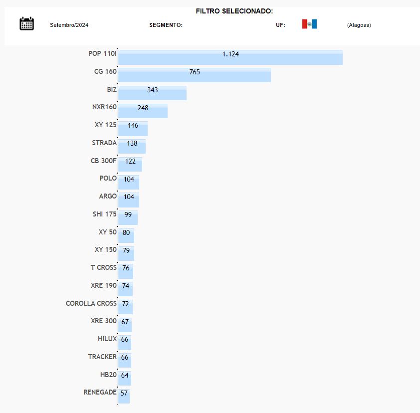 Considerando todos os veículos, de todas as categorias, as motocicletas da Honda lideram com folga o emplacamento. POP 110, CG 160, BIZ e NXR 160 estão nas primeiras 4 posições e juntas emplacaram 2.480 unidades.