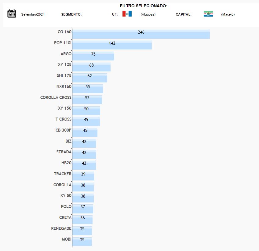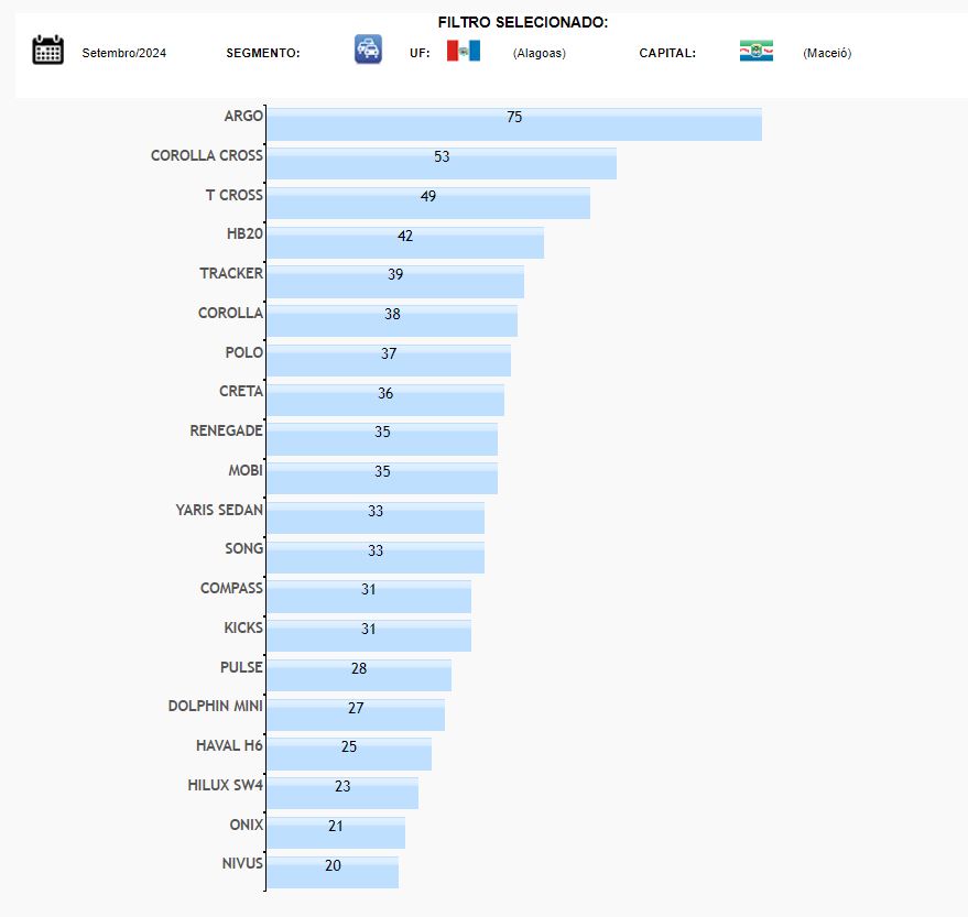Considerando as vendas só de Maceió, o Fiat Argo foi o mais vendido com 75 unidades emplacadas em setembro. Toyota Corolla Cross e VW T-Cross ficaram na 2ª e 3ª posições respectivamente.
