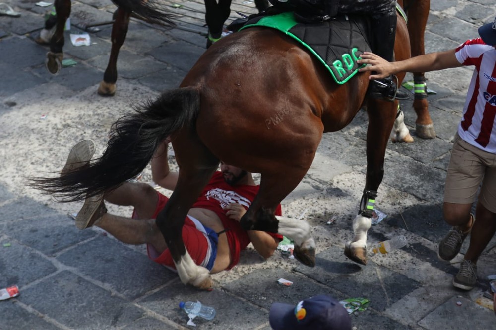 O homem ainda ficou um tempo embaixo do cavalo sendo pisoteado, mas conseguiu sair. O torcedor foi acolhido por pessoas que estavam por perto e o ajudaram. Ele não sofreu graves ferimentos.