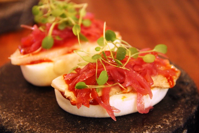 Na A Casa do Porco: Pão no vapor com barriga de porco,cebola roxa e pimenta fermentada