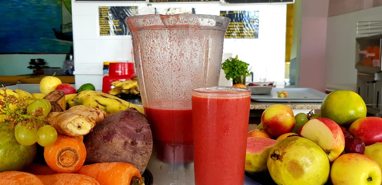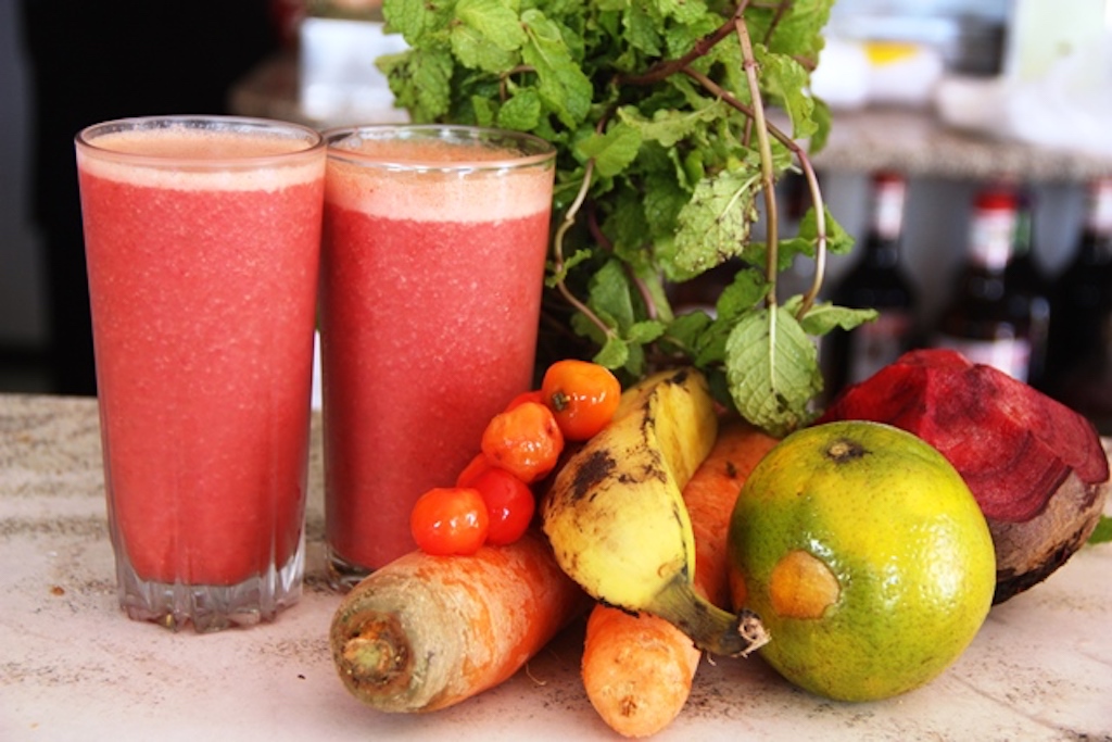 10 em 1: suco de laranja, acerola, banana, limão, beterraba, cenoura, guaraná em pó, hortelã, goiaba, abacaxi, maçã, uva e gengibre