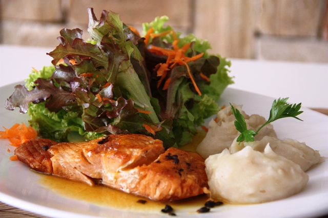 Medida certa: salmão grelhado ao molho de maracujá, com purê de batata doce no perfume de laranja e gengibre. O peixe vem escoltado de arroz sete grãos e salada. Leve, saboroso e que satisfaz no Manga Verde