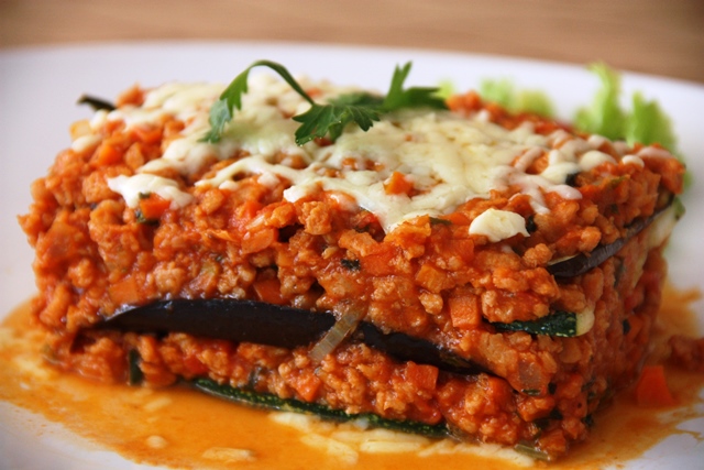 “Burguesa”, lasanha de berinjela com abobrinhas, proteína de soja ao molho de tomate caseiro e queijo parmesão. Para quem não gosta de legumes pode achar estranho, mas a ideia da berinjela e abobrinha é saudável