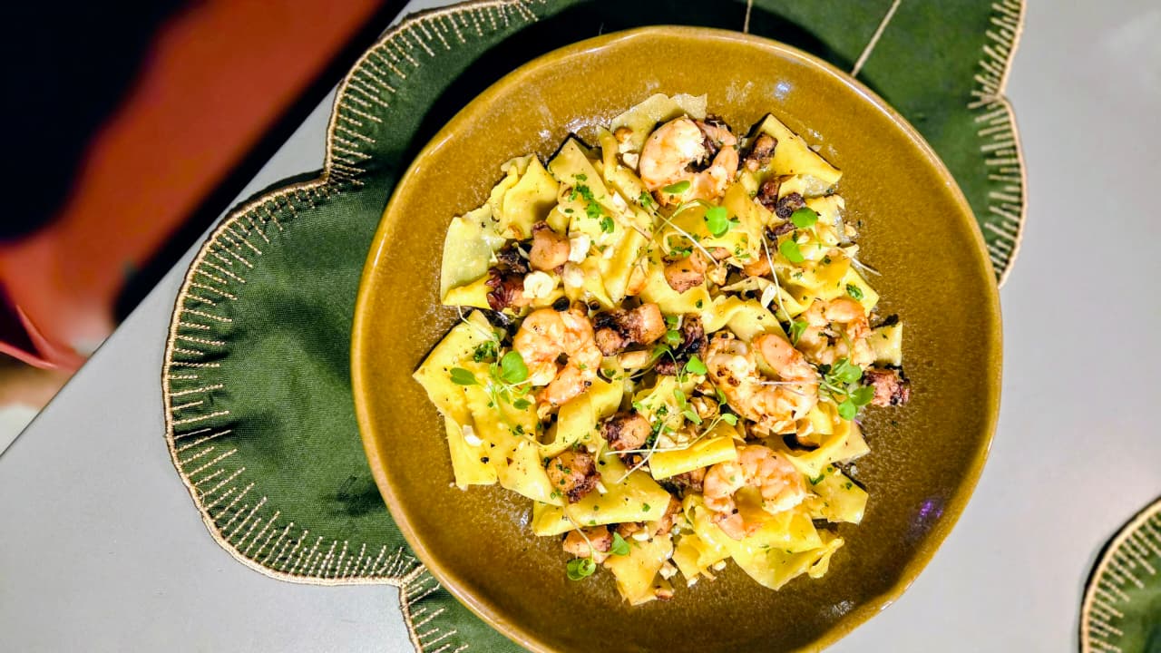 Pappardelle com camarão e polvo