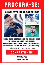 Alan Aldacir da Silva, de 31 anos, que trabalha em um estabelecimento que vende rações, desapareceu ao tentar enfrentar a correnteza do Rio São Miguel, que transbordou e invadiu a cidade de São Miguel dos Campos, na Zona da Mata alagoana, na noite de quarta-feira, 25. Segundo a família, o rapaz estava acompanhado de dois irmãos e tentou segurá-los no momento em que era arrastado pela água, porém não conseguiu ser salvo.