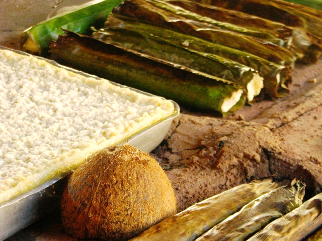 O grude (foto de cima), também conhecido como malcasado, é a mais singela das receitas tradicionais das Alagoas, é a miscelânea do coco ralado com a massa da tapioca. Quando vira grude nas mãos, é tempo de deitar a mistura na folha da bananeira até assar.
