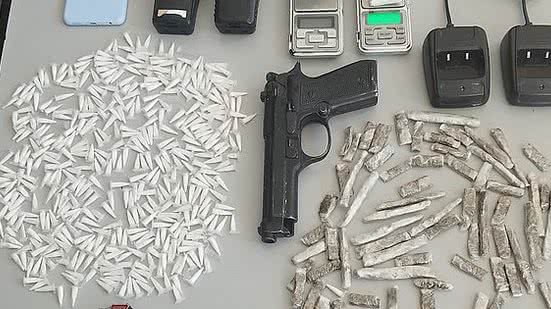 Ainda segundo a PM, cães farejadores foram solicitados para verificar a área do terreno onde o criminoso estava e, após buscas, a bolsa foi localizada. Dentro dela, foram encontrados e apreendidos 02 rádios comunicadores, 04 munições de calibre 12, um simulacro de pistola, 02 balanças de precisão, 138 gramas de maconha, 137 gramas de cocaína e 3 gramas de crack.