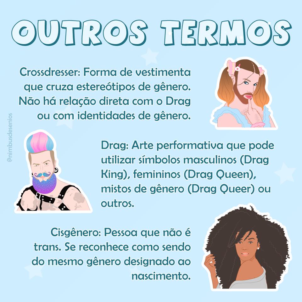 Na prática, quase todo mundo entende os termos “gay”, “lésbica” ou “bissexual”, mas quando se trata de outros termos a coisa complica. A página Uma Nuvem Que Tenta criou um mini guia ilustrado de termos explicando direitinho o que significa ser drag queen, mulher ou homem trans, travesti, entre outras palavrinhas que, para muita gente, ainda se confundem. Confira: