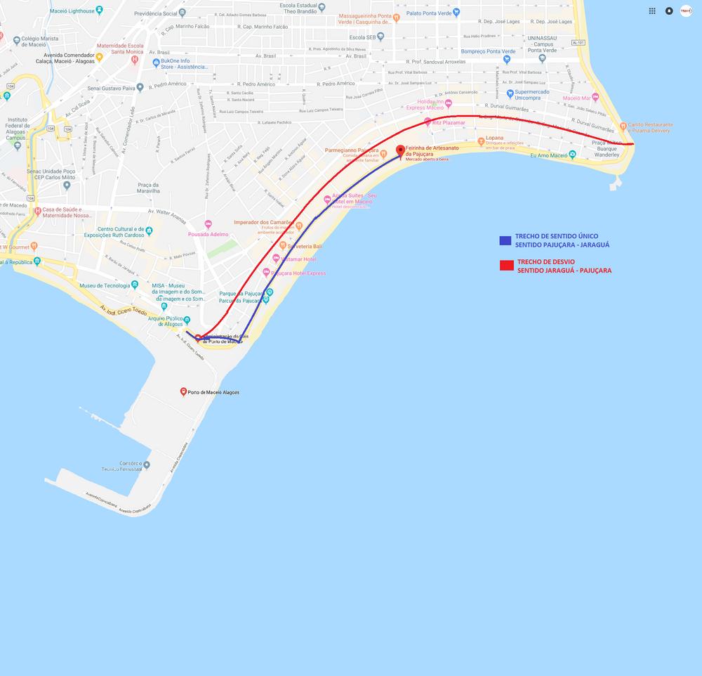 O trecho afetado vai da Feirinha do Artesanato, na Avenida Dr. Antônio Gouveia, até o Porto de Maceió, no Jaraguá. Dessa forma, o motorista que dirige do Jaraguá em direção a Pajuçara deverá pegar a Rua Epaminondas Gracindo, passando pela Rua Jangadeiros Alagoanos e Rua Engenheiro Mário de Gusmão pra sair na Ponta Verde.
