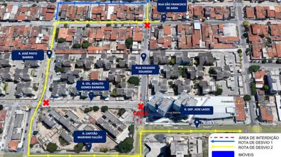 Durante o andamento das obras, parte da via será isolada para a segurança da população e dos trabalhadores. O bloqueio ocorrerá a partir do cruzamento da Soldado Eduardo dos Santos com a rua São Francisco de Assis até a avenida Deputado José Lages. Além disso, o acesso à rua Coronel Adauto Gomes Barbosa também estará interditado, conforme mapa acima. O acesso aos edifícios e estabelecimentos comerciais da área será garantido a moradores, visitantes e comerciantes.