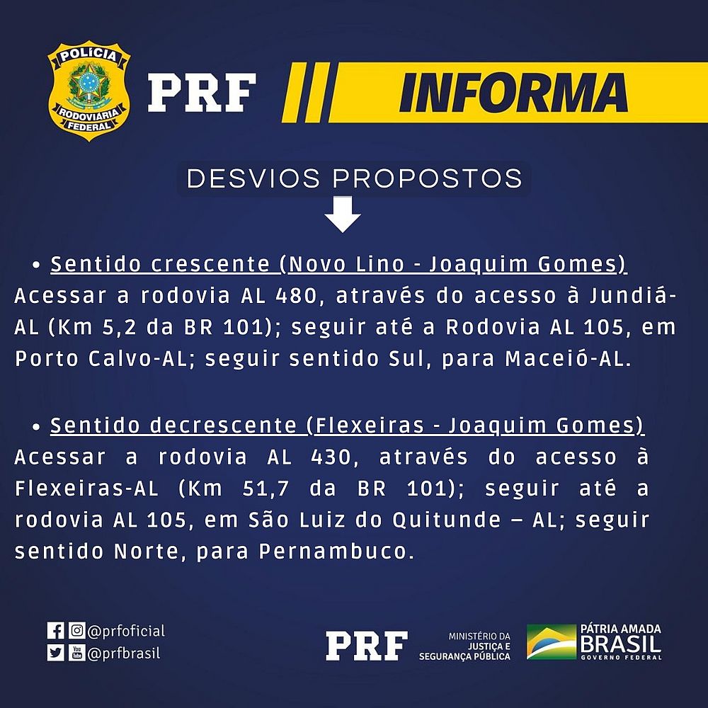 A PRF orientou que os condutores que seguem no sentido Novo Lino/Joaquim Gomes podem trafegar pela AL-480, a partir do quilômetro 5 da BR-101, no caminho de Jundiá. Os motoristas devem seguir até a AL-105, em Porto Calvo, e seguir no sentido Sul, para Maceió.