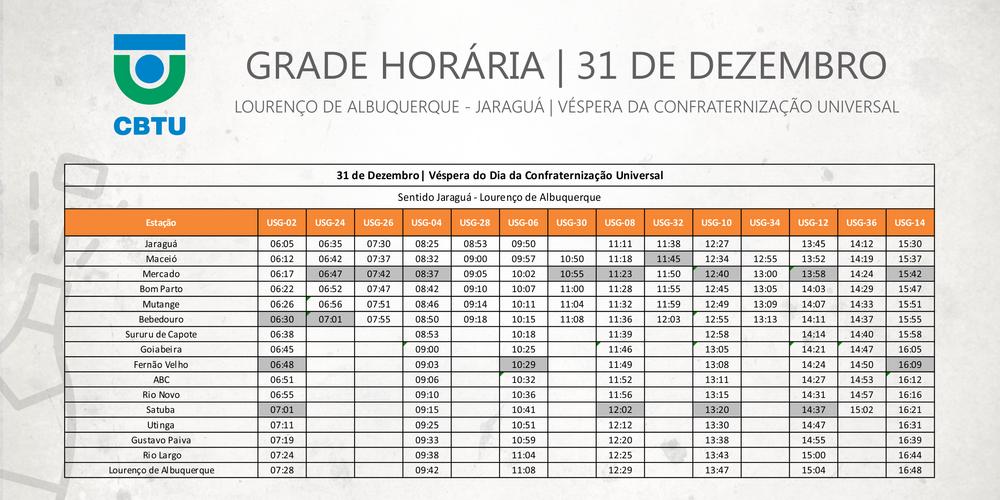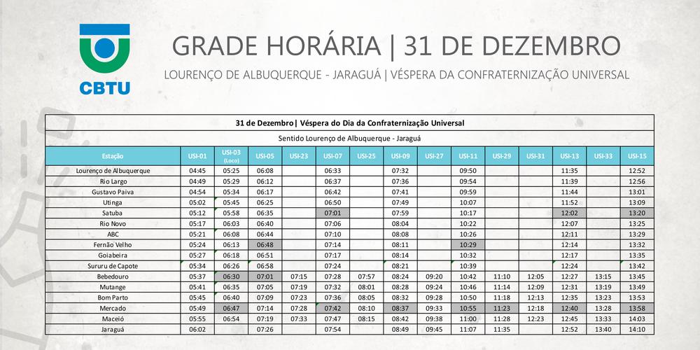 A Companhia Brasileira de Trens Urbanos – CBTU Maceió, comunica que, no dia 31/12/2018 (segunda-feira), véspera de ano novo, os trens irão circular em horário especial, conforme grade abaixo/anexo.