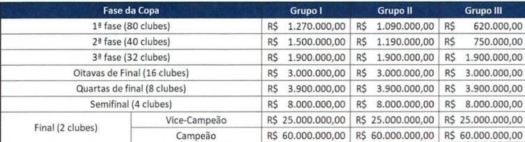 A premiação a cada fase superada na Copa do Brasil é um atrativo a mais. A Confederação Brasileira de Futebol (CBF) aumentou o valor do prêmio final para R$ 60 milhões (em 2021 foram R$ 56 mi), mas os valores acumulados ao longo da competição podem chegar a R$ 80 mi para o time vencedor.
