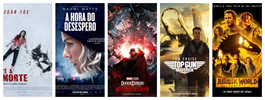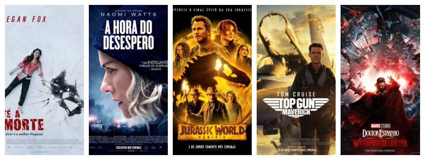 Também tem estreia na parte alta da cidade, o filme ‘A Hora do Desespero’, que fala de uma mãe recentemente viúva, Amy Carr, que está fazendo o possível para restaurar a normalidade na vida de sua filha e de seu filho adolescente em sua pequena cidade do interior. Enquanto ela está fazendo sua corrida matinal na floresta, ela encontra sua cidade no caos quando um tiroteio ocorre na escola de seu filho. Outra estreia esperada é o filme ‘Até a Morte' que fala da história de Emma, ela está infeliz no casamento com seu marido frio e controlador, Mark, um advogado criminal. Depois de terminar seu caso com Tom, sócio da empresa do marido, Emma sai com Mark para comemorar o aniversário de casamento e a leva para uma casa isolada no lago que eles costumavam visitar no início de seu relacionamento. Na manhã seguinte, Emma acorda e se encontra algemada a Mark, morto. Continua em exibição os filmes: ‘Doutor Estranho no Multiverso da loucura’ e ‘Top Gum’.