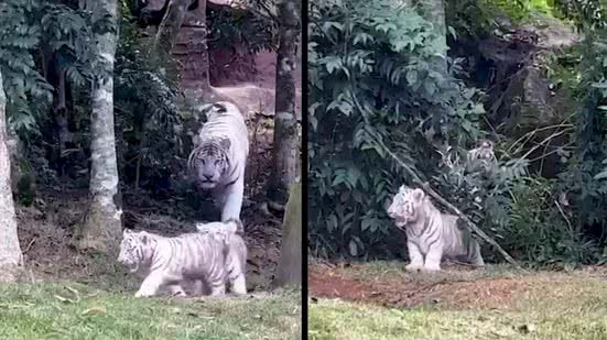 O jogo do tigrinho tá diferente. Os filhotes brincam o dia inteiro, conta a mulher que os acompanha desde o nascimento deles, no dia 20 de março de 2025. "Você já teve gato? Ele rola pra cima do outro, se esconde, ataca, fica esperando você passar para dar um salto." É a mesma coisa.