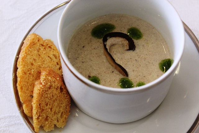 Consommé (caldo) de cogumelos com gengibre e cebolete da chef Miau