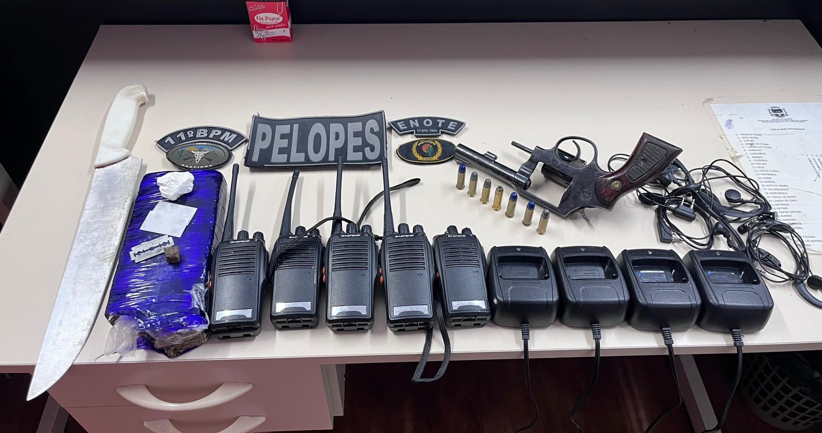 Os policiais do 11º Batalhão apreenderam um revólver de calibre 38, munições, facas, rádios de comunicação e fones de ouvido. Além disso, uma quantidade de drogas foi recolhida.