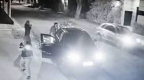 Um homem usando camiseta e distintivo semelhantes ao da Polícia Civil desembarca do banco do passageiro do Audi segurando um fuzil. Com a arma de grosso calibre, ele ainda mira na direção em que o carro do empresário seguiu e atira uma vez, enquanto o carro dos bandidos é carregado com objetos das vítimas. Após isso, a quadrilha foge.