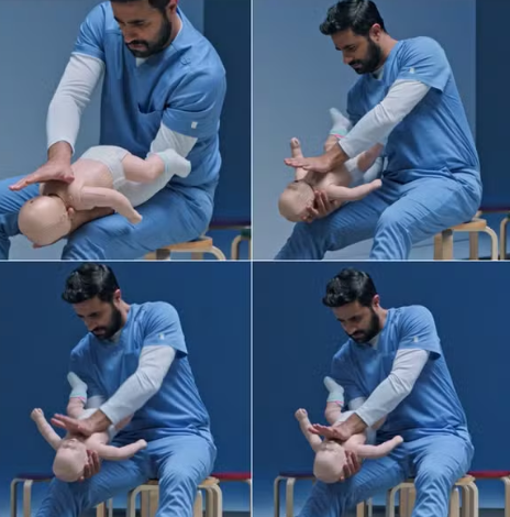 Para bebês com menos de 1 ano, o procedimento também foi ajustado: deve-se alternar cinco pancadas nas costas e cinco compressões no peito, usando a base da palma da mão, até que o corpo estranho seja expulso ou até que o bebê perca a consciência.