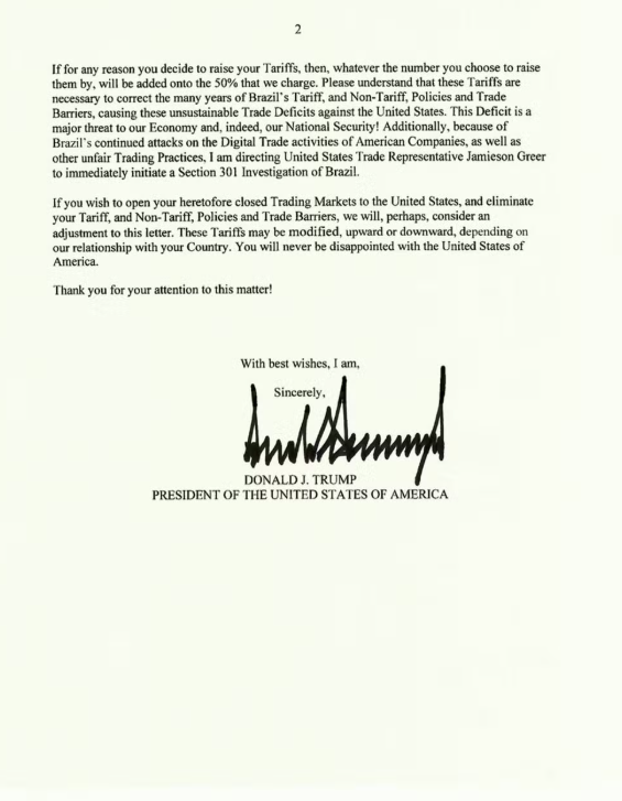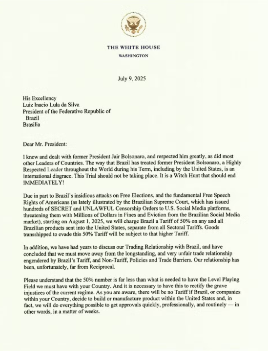 No documento, Trump cita Jair Bolsonaro e diz ser "uma vergonha internacional" o julgamento do ex-presidente no Supremo Tribunal Federal (STF) ao justificar a elevação da tarifa sobre o Brasil.