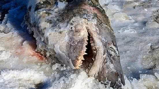 "Não é o que eu esperava encontrar na minha aventura de inverno congelante", escreveu Amie Medeiros em resposta a um seguidor no Instagram, na foto em que ela postou do predador em seu perfil na rede social. O registro foi feito enquanto ela passeava pelo local. No post, é possível ver cortes na barbatana do peixe.