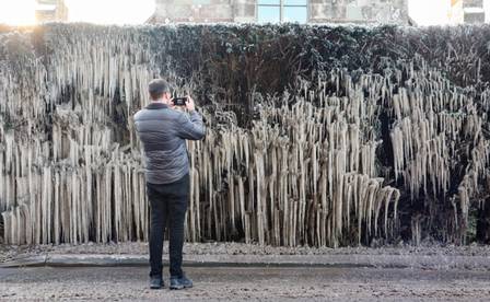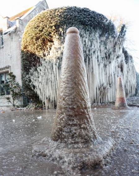 Uma tubulação rompida em calçada criou um fenômeno de gelo brilhante que deixou moradores de Staunton (Inglaterra) de queixos caídos. Imagens viralizaram nas redes sociais após registro de Helen Stratford. Centenas de barras de gelo foram formadas após a água jorrar nas baixas temperaturas da região, criando um visual de "outro planeta". Sua filha, Sabrina, de 9 anos, ficou encantada com a formação e a comparou com um órgão gigantesco de catedral. As imagens viralizaram, e o local virou atração turística instantânea.
