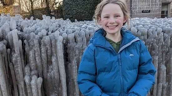 Uma tubulação rompida em calçada criou um fenômeno de gelo brilhante que deixou moradores de Staunton (Inglaterra) de queixos caídos. Imagens viralizaram nas redes sociais após registro de Helen Stratford. Centenas de barras de gelo foram formadas após a água jorrar nas baixas temperaturas da região, criando um visual de "outro planeta". Sua filha, Sabrina, de 9 anos, ficou encantada com a formação e a comparou com um órgão gigantesco de catedral. As imagens viralizaram, e o local virou atração turística instantânea.