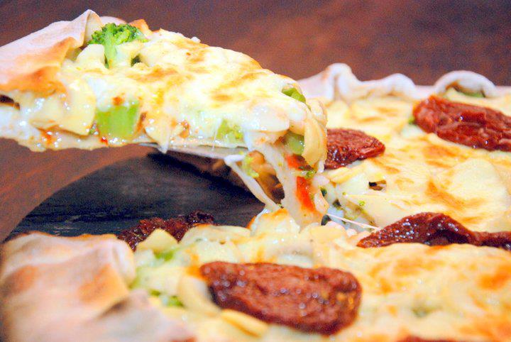Pizza vegetariana com molho de tomate, brócolis, milho, mussarela, tomate, cebola, e orégano. A criação é da Boss Traditional Pizza.(82)3325-2222
