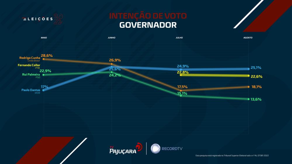 Paulo Dantas (MDB) manteve a liderança, passando de 24,9% da pesquisa anterior para 25,1%. Fernando Collor (PTB) também manteve sua posição (2º lugar), com uma pequena queda passando de 22.8% na pesquisa de julho, para 22,6% neste novo levantamento.