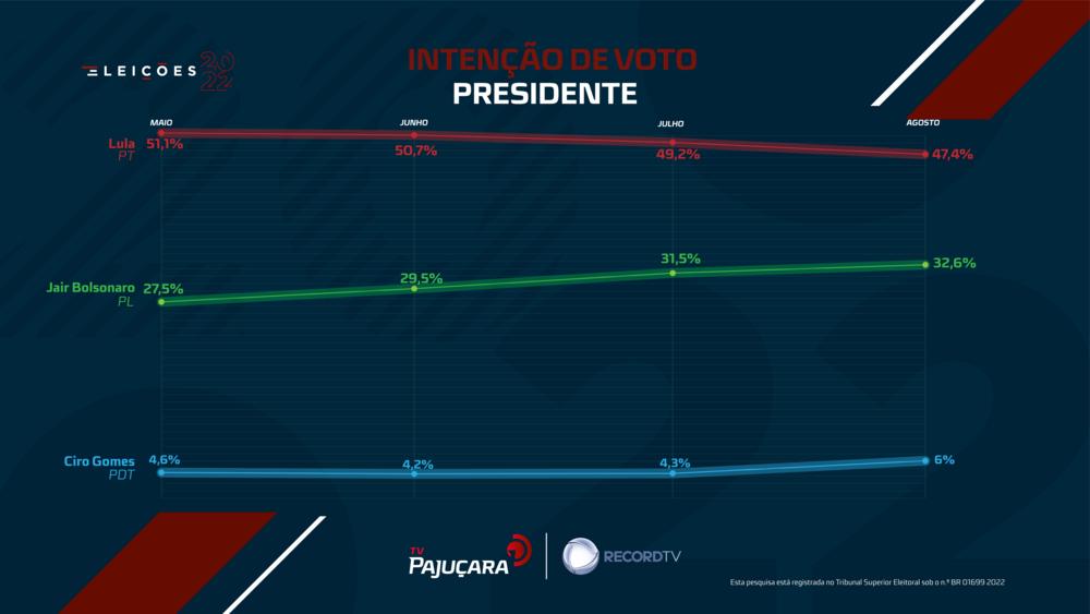 Em Alagoas, a disputa pelo Palácio do Planalto também se manteve semelhante à pesquisa de julho, porém com uma queda de 2,9% na distância entre os candidatos Luiz Inácio Lula da Silva , do PT (47,4%) e Jair Bolsonaro (PL) que cresceu na intenção de votos aparece com 32,6%. Ciro Gomes continua na 3ª posição com 6%.