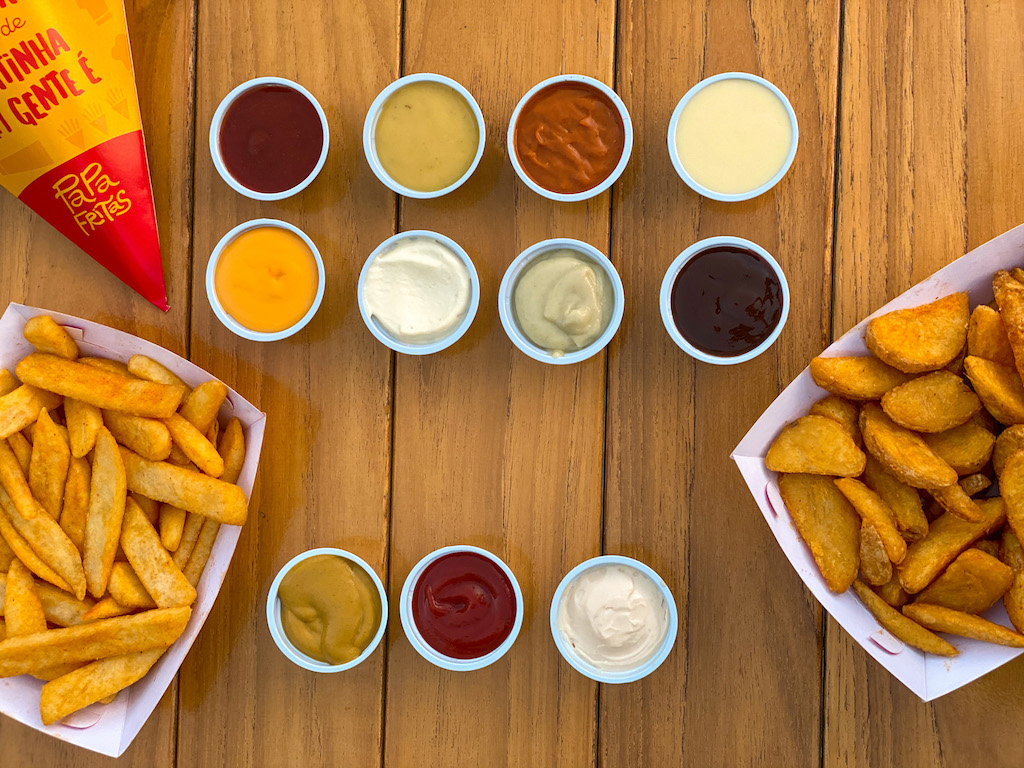 São oito molhos (cheddar, barbecue, ketchup de goiaba, gorgonzola, mostarda e mel, molho de alho, picante e parmesão) exclusivos da casa, tudo sem glúten ou óleo, o que agrega mais valor às batatas fritas.