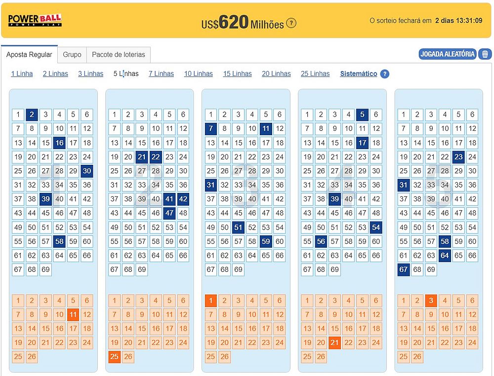 3) Escolher 5 números principais e um número adicional "Power Ball".