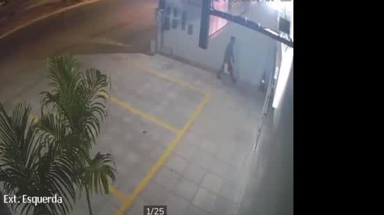 Imagens de um circuito de segurança (veja abaixo) mostram o suspeito tentando arrombar a porta de um dos estabelecimentos comerciais. O crime foi frustrado após o alarme do local disparar.
