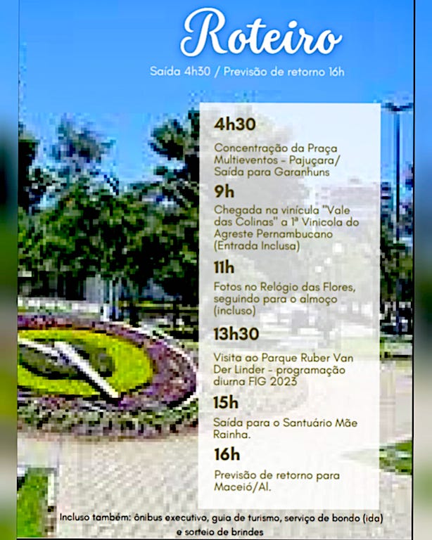 No roteiro, uma visita à primeira vinícola do Agreste de Pernambuco, a Vale das Colinas; um almoço no sistema “buffet livre”, no Restaurante Chalé; visita ao conhecido Relógio da Flores e ao Santuário Mãe Rainha; além de parte da programação diurna do festival! Gostei e vou.