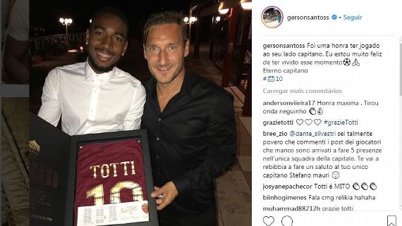 O então camisa 10 da Roma praticamente adotou o brasileiro como um pupilo durante sua última temporada como profissional. "Ele é um cara que eu via jogar quando criança e tive a oportunidade de dividir vestiário e tive como um professor. Me ensinou muito dentro e fora de campo. Não tenho palavras pra descrever tudo que ele fez por mim logo na minha chegada aqui", agradeceu.