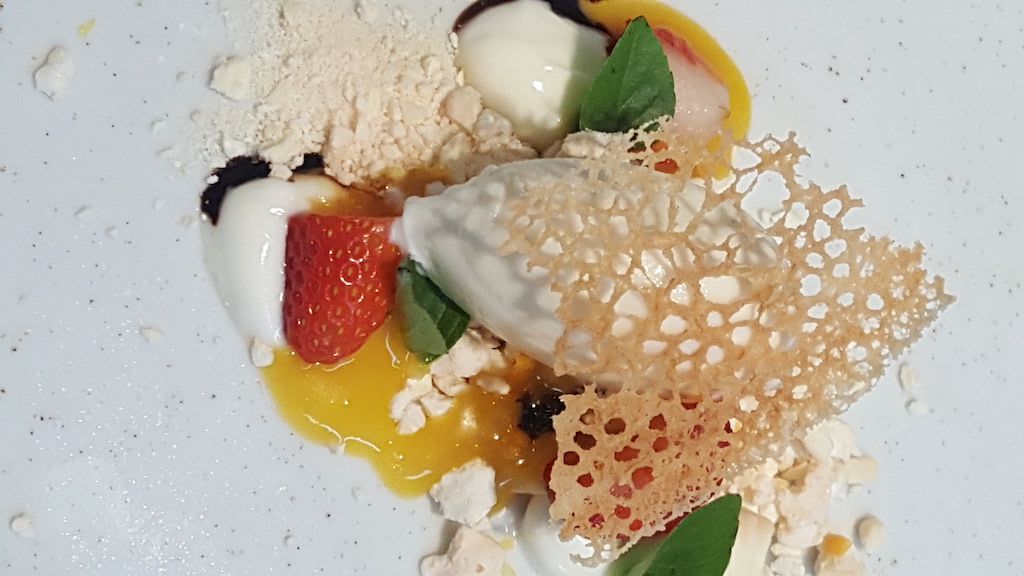 A outra sobremesa, o chef usou dois ingredientes de Maragogi, as broinhas e os minis suspiros que viraram uma farofinha para receber a doce baba de moça, morangos frescos, redução de vinagre balsâmico, iogurte grego, manjericão, sorvete de tapioca, raspas de limão e laranja e a renda crocante. Soberbo!