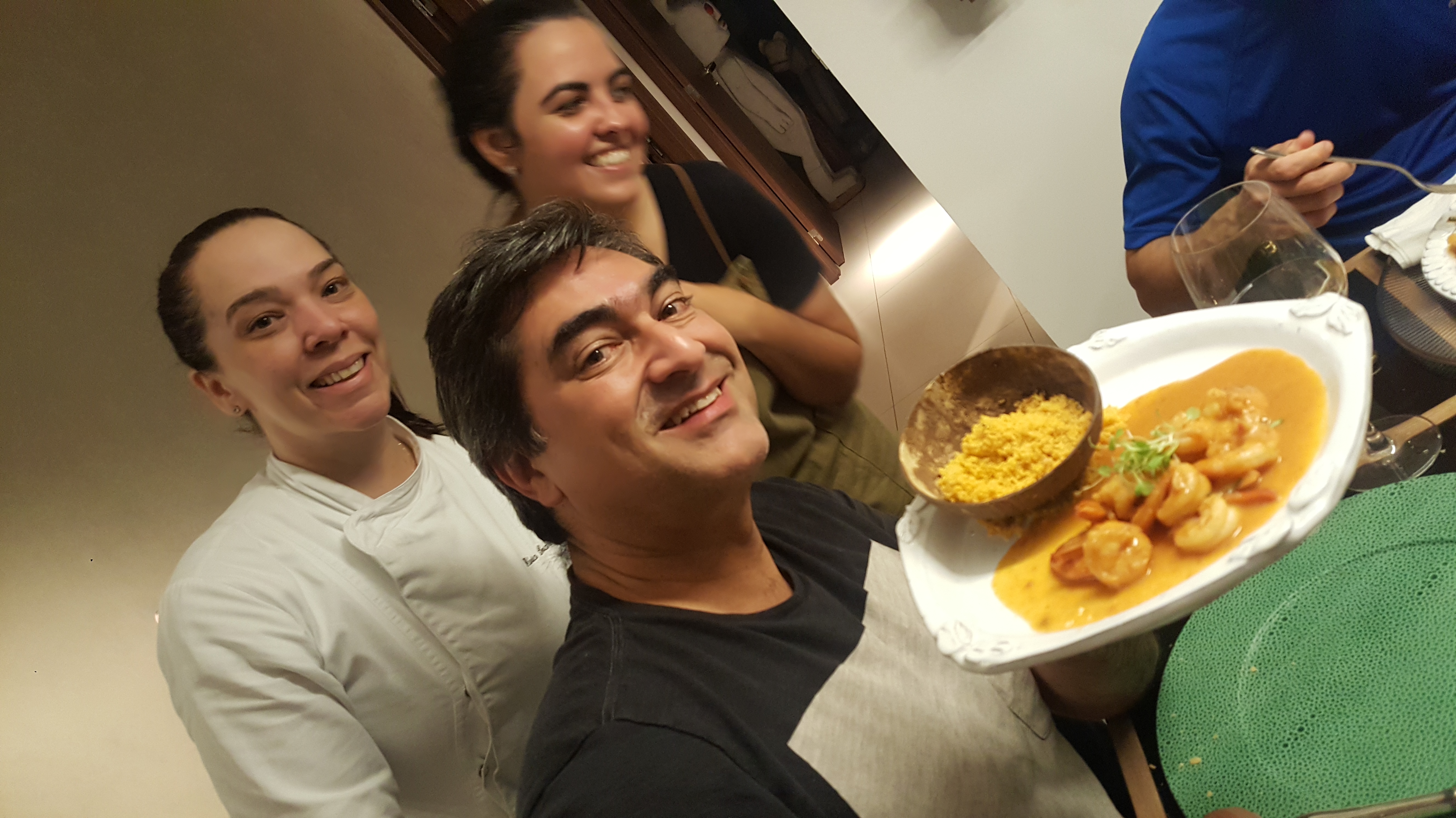 “Tô na foto aí com Mariana e Flávia (e sua incrível recriação do famoso camarão do antigo Bar das Ostras). Mas a lasanha da Denise, o siri do Thiago e as sobremesas indescritíveis do Thawã Calixto (olha as fotos!) também estavam demais. E só pra não passar em branco, o grande mestre @picui (Wanderson Medeiros) estava lá degustando com a gente… Depois não sabem por que eu gosto tanto de Maceió… Obrigado, amigos!