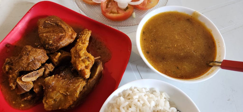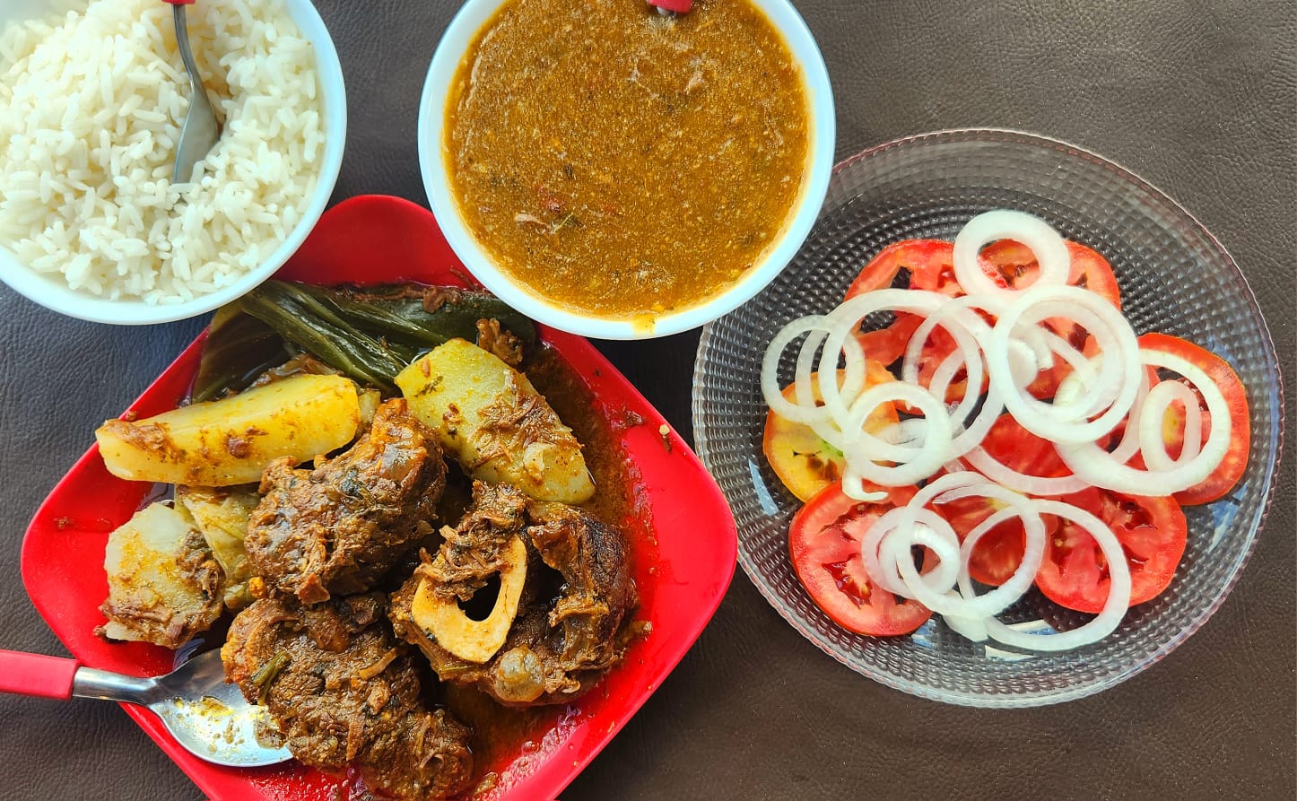 Pirão com guisado com carneiro, arroz e salada para uma pessoa