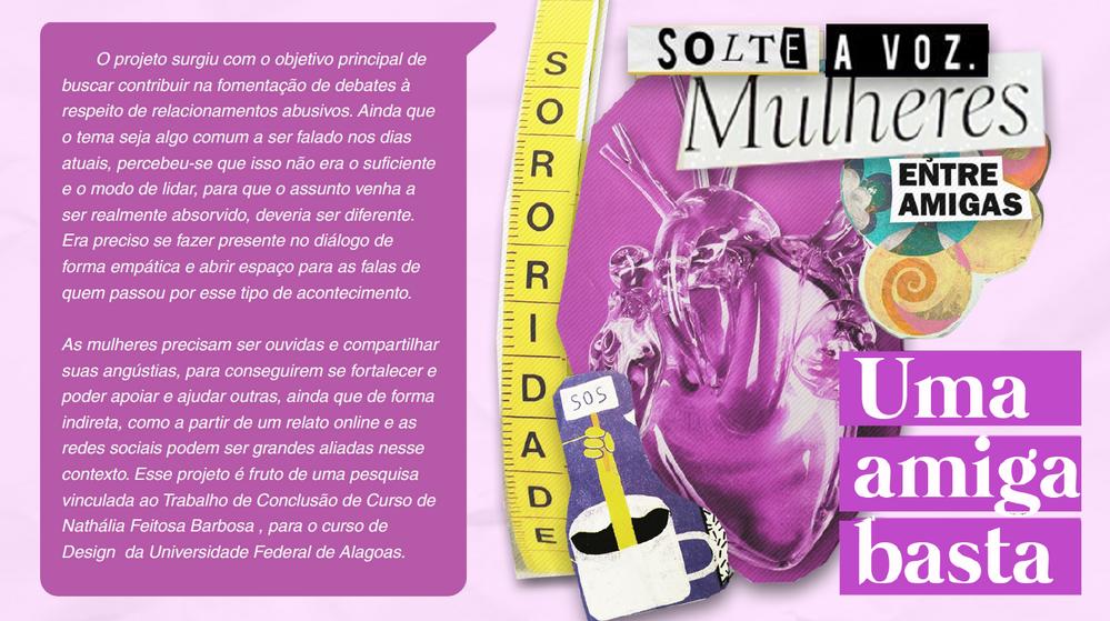 O desenvolvimento teórico pode ser visto em: www.led-ufal.com/umaamigabasta, onde nele discorre-se sobre o papel social do design vinculado às necessidade da questão dos relacionamentos abusivos, buscando uma maneira de contribuir para essa discussão a partir do design gráfico.