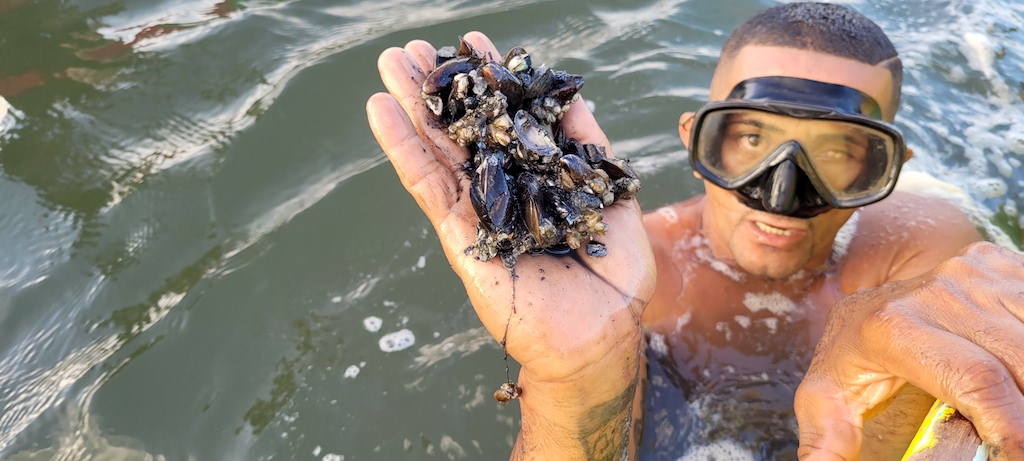 Pescador mergulha para mostrar como acontece a pesca do sururu