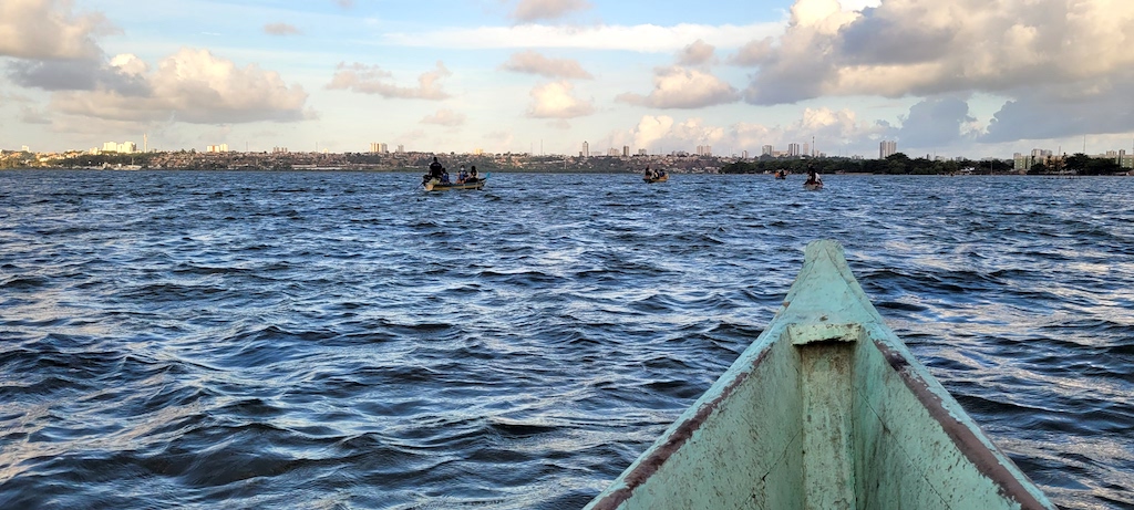 Sábado, 11 de dezembro, foi dia de ver o sol se pôr na nossa Lagoa Mundaú que, apesar do desgaste, ainda é uma benção para a comunidade da Favela Sururu, dando sustento e muita diversão aos seus moradores. Vi crianças brincando nas águas doces, e a gente emerge nesse mundo onde as águas da lagoa trazem felicidades. Também ouvi o depoimento de João, e são muitos Joãos e Marias que nasceram na beira da lagoa e vivem da pesca do sururu, as vezes madrugada adentro, para que a gente possa comer a tradição alagoana no leite de coco ou no capote (casca). Quando a pesca está boa, rende 50 quilos diários.