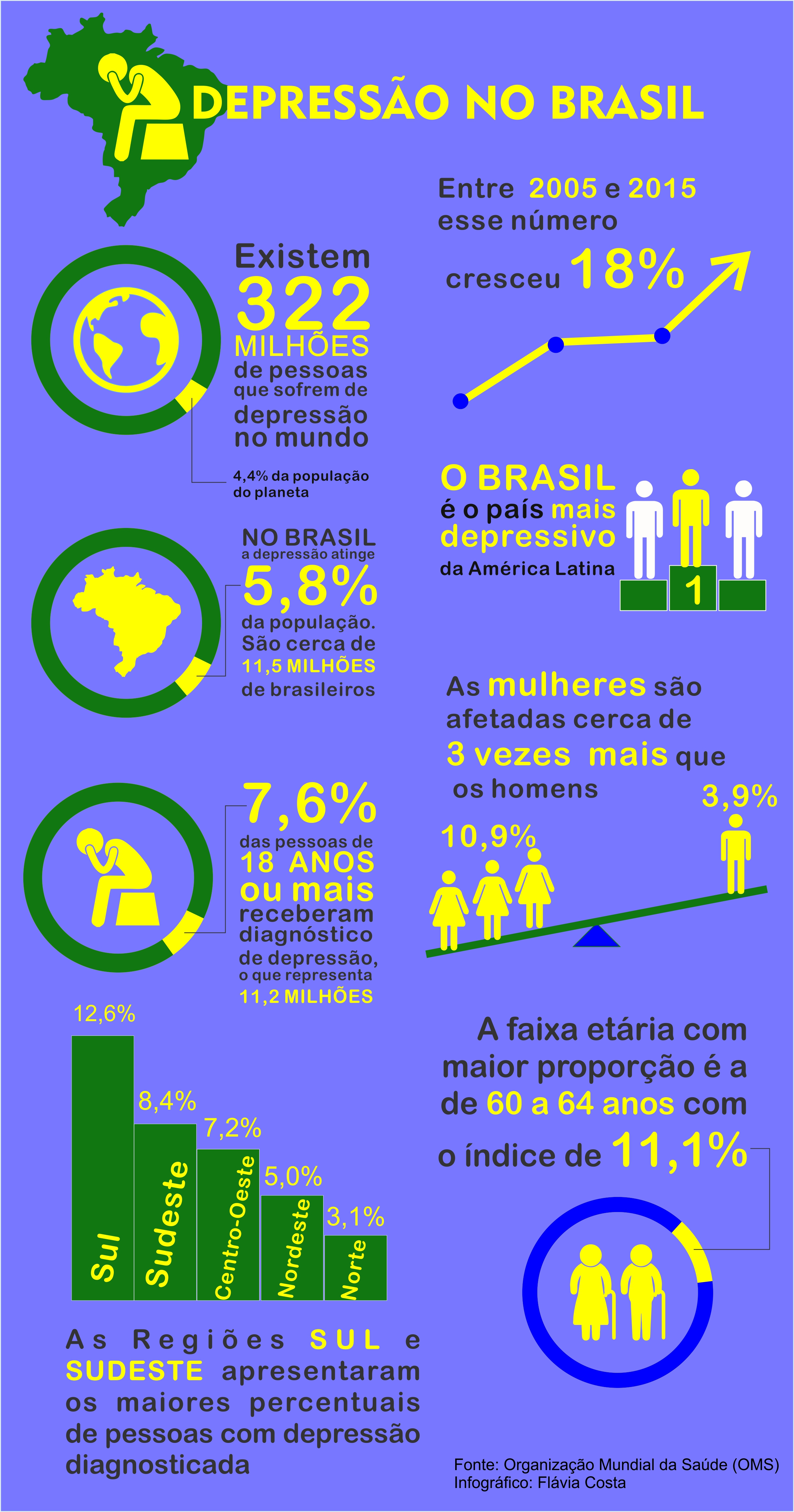A depressão é uma doença que afeta o emocional das pessoas, apresentando como sintomas frequentes a tristeza profunda, falta de apetite e de ânimo, pessimismo, baixa auto-estima, além de provocar grande oscilação de humor e a ausência de prazer em atividades corriqueiras. Conforme a Pesquisa Nacional de Saúde, realizada em 2013 pelo Ministério da Saúde e pelo Instituto Brasileiro de Geografia e Estatística (IBGE), são mais de onze milhões de brasileiros diagnosticados com depressão.