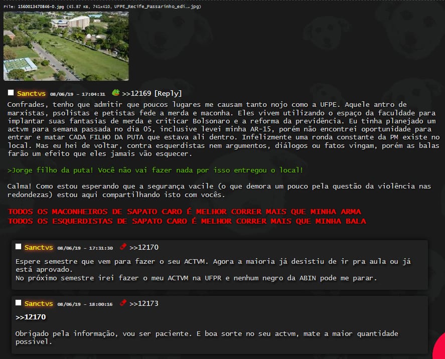 De acordo com os prints, o endereço virtual onde estaria sendo organizado o ataque se chama Dogolachan, mesmo espaço em que teria sido planejado o ataque a uma escola de Suzano (SP). As conversas afirmam, inclusive, que uma das pessoas que estão planejando o ataque já teria levado uma AR-15 para a UFPE no último dia 05 de junho e espera apenas "uma falha na segurança". Muitos alunos estão com medo de frequentar o Campus Recife da UFPE.