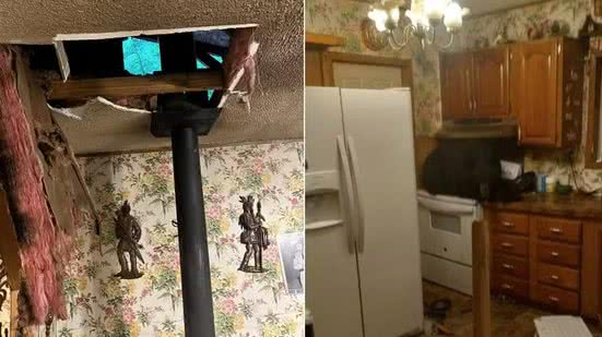 Os agentes chegaram ao local e encontraram o urso sentado no fogão da cozinha. O teto não havia resistido ao peso do animal.