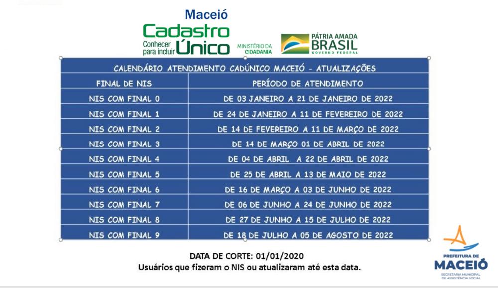 “O calendário de atualizações terá início no dia 3 janeiro de 2022 e terminará no dia 5 de agosto. O período de atendimento seguirá o final do NIS de cada usuário. Por isso, eles devem ficar atentos ao calendário”, explicou.