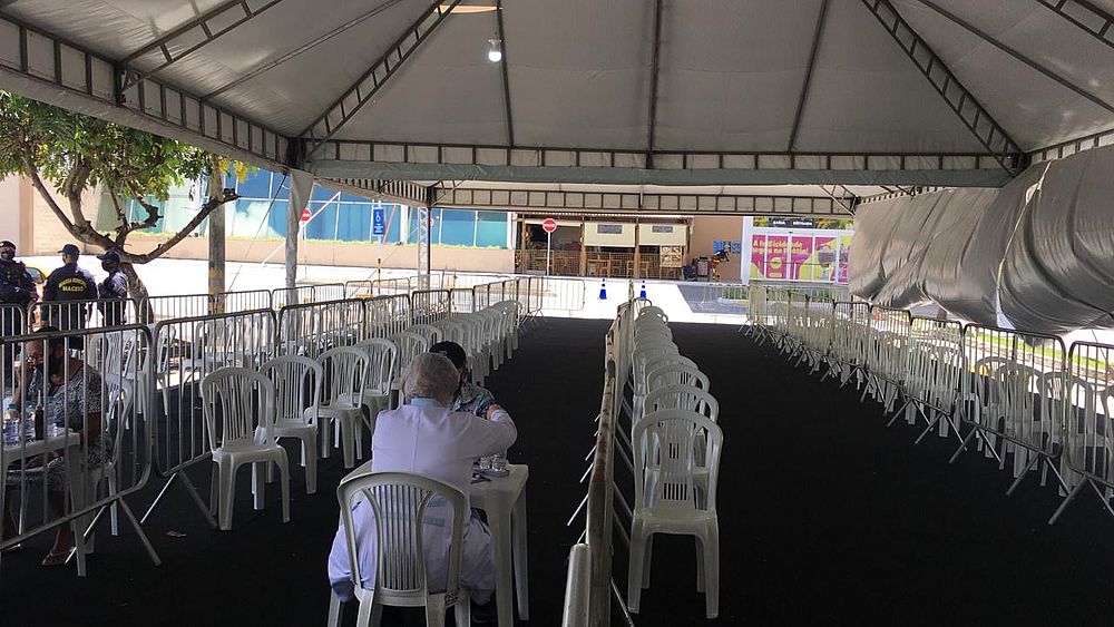 Tanto no Pátio Shopping, no Benedito Bentes, quanto no Maceió Shopping, em Mangabeiras, a procura dos profissionais também foi menor comparado aos dias anteriores. A imagem abaixo mostra duas pessoas sendo vacinadas, com quatro fileiras de cadeiras vazias no centro comercial da parte alta.