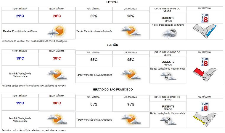 Na Zona da Mata, a situação é idêntica a Maceió: temperatura mínima de 21ºC e máxima de 28ºC. Há possibilidade de chuva pelo período da manhã e da noite.