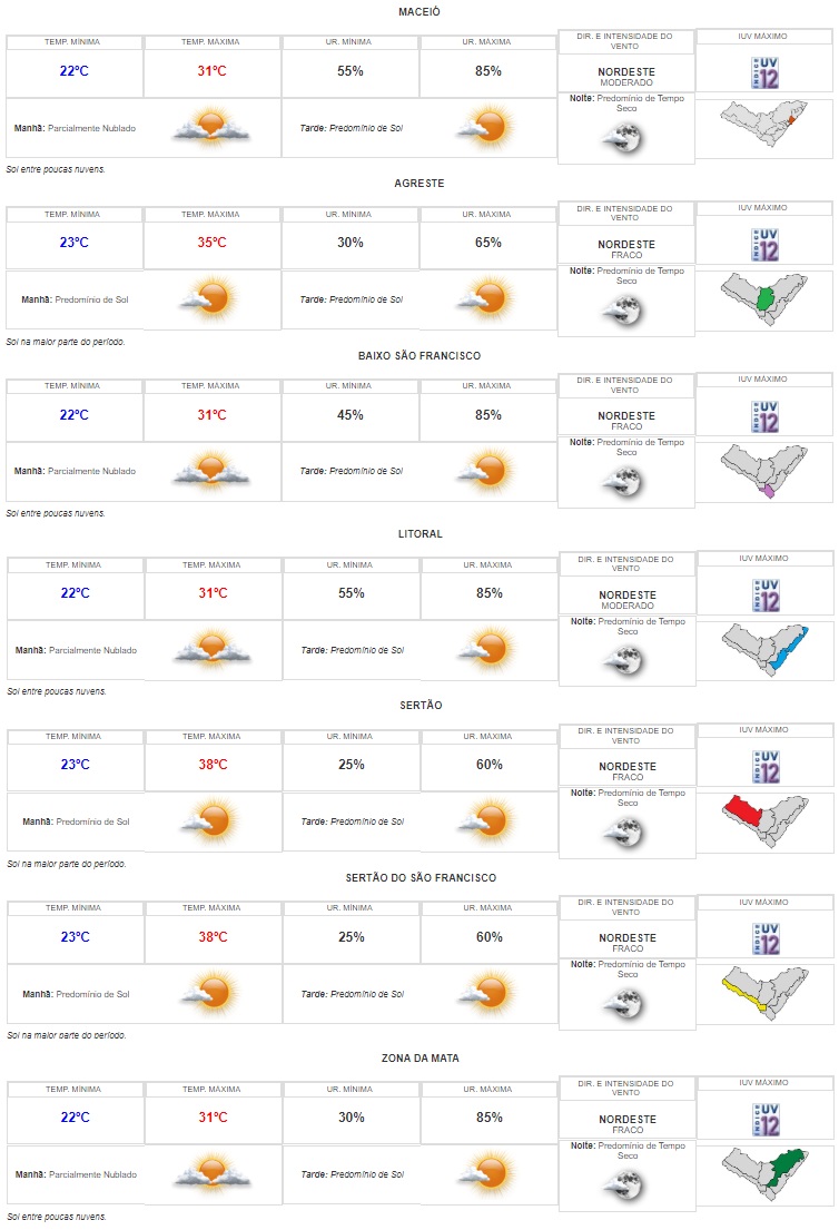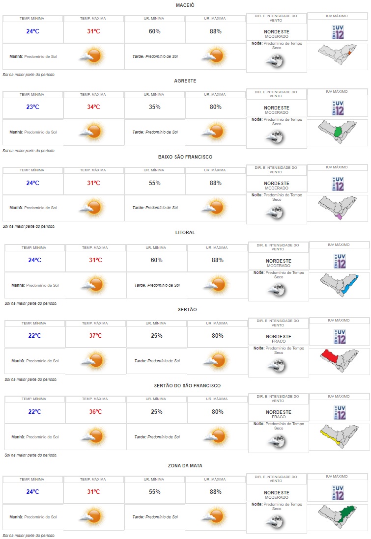 Na capital Maceió, no Litoral, na Zona da Mata e no Baixo São Francisco, o sol pode aparecer entre nuvens no domingo pela manhã, porém o sol deve continuar a predominar no restante do dia. Confira a seguir a previsão completa para o 24 de novembro.